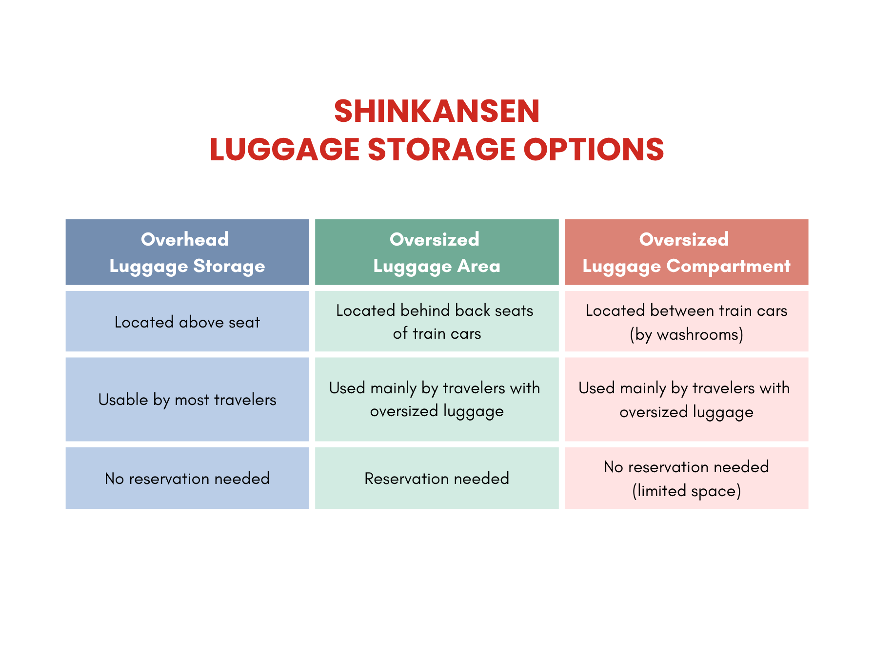 - Oversized Baggage Area: Located behind the rear seats of Shinkansen bullet train cars and requires a reservation to use, with the reservation for the seat grouped in.