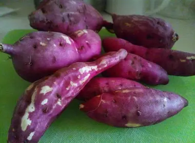 · Satsuma-imo (さつまいも, 薩摩芋): Japanese sweet potato. The skin is purple with light yellow flesh inside. It differs from sweet potatoes with orange flesh (best known in the west) by its smooth consistency, closer to the potato. Baked with the skin on, it's a real treat. It has a sweet, nutty flavor. It is also popular pureed.