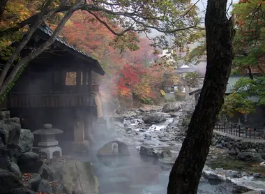 In Gunma prefecture, Takaragawa onsen has four gigantic rotenburo at the edge of a mountain river. The total area is 450 tatami - that's more than 700m2. Three are mixed sex (note that you can keep a towel with you), and one is available for women only. The four baths each have their own individual features. We advise you to come here in the fall to enjoy koyo, viewing the flaming-red maple leaves from the onsen.