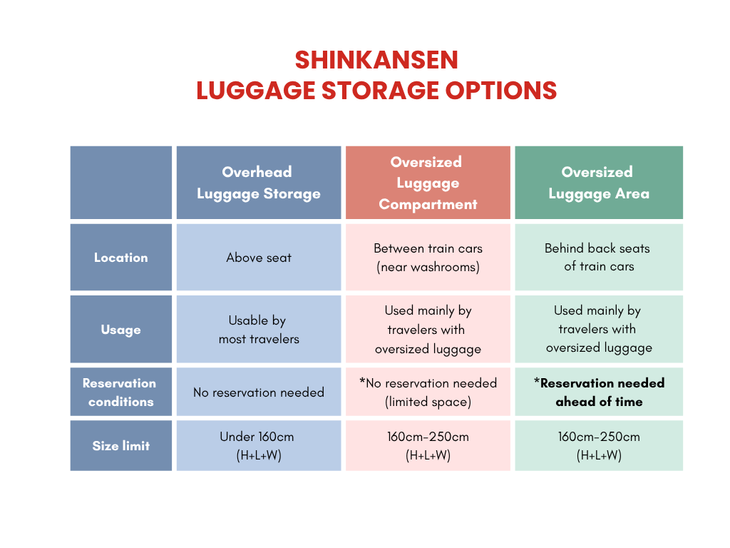 - Oversized Baggage Area: Located behind the rear seats of Shinkansen bullet train cars and requires a reservation to use, with the reservation for the seat grouped in.